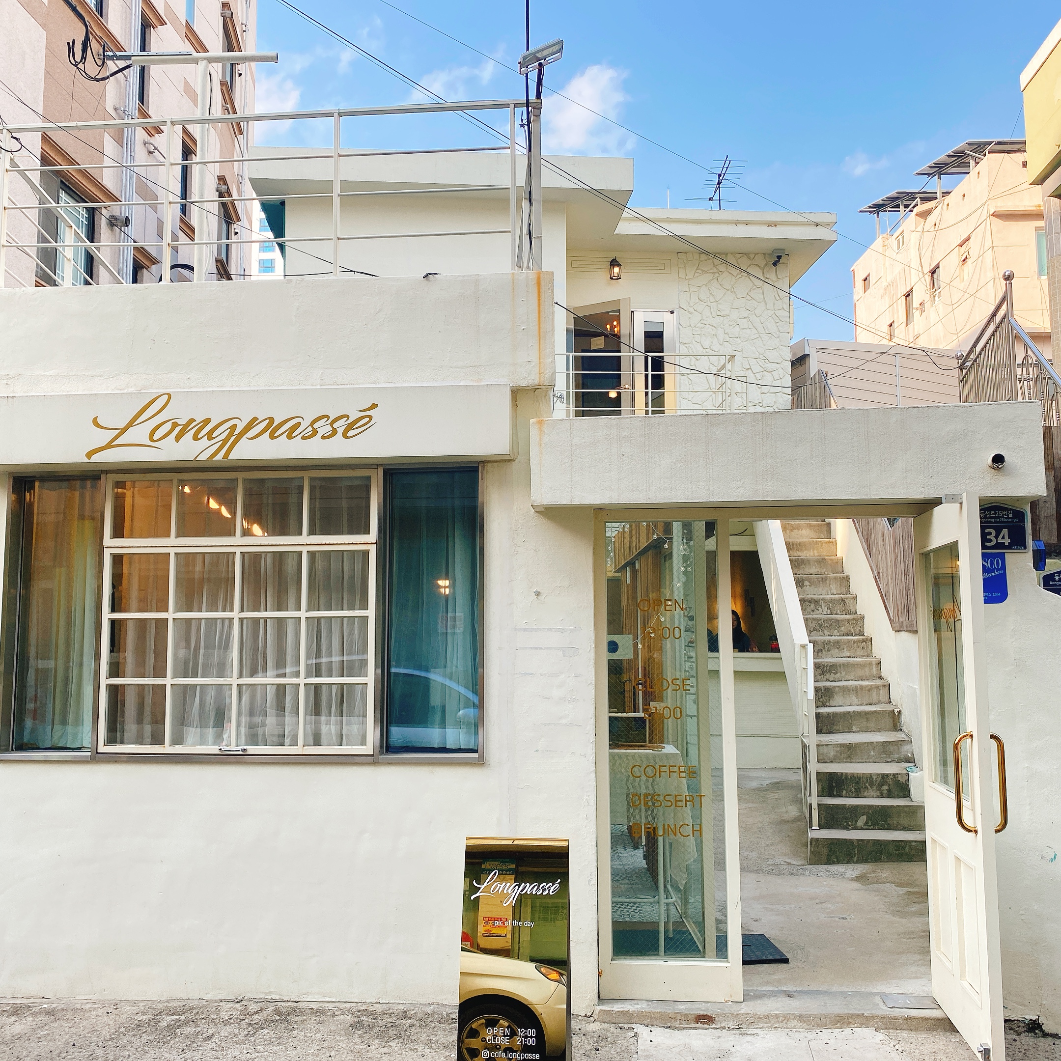 조용한 골목에 위치한 롱파쎄! 2층 주택을 개조한듯한 화이트톤의 외관이 외국느낌을 풍긴다.
