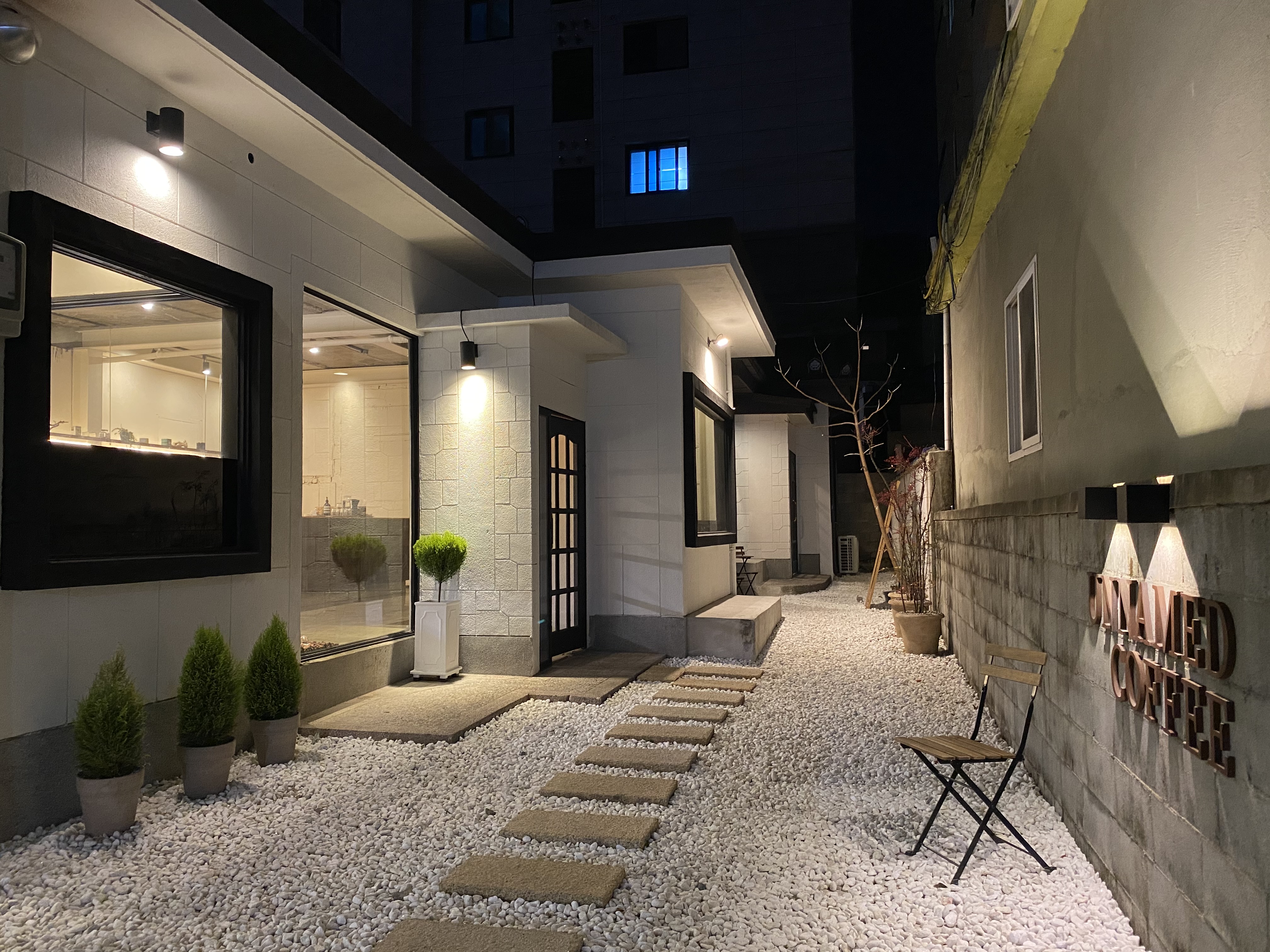 밤에는 어둠과 조명이 더해져 더욱 운치있는 카페로 변했다.
