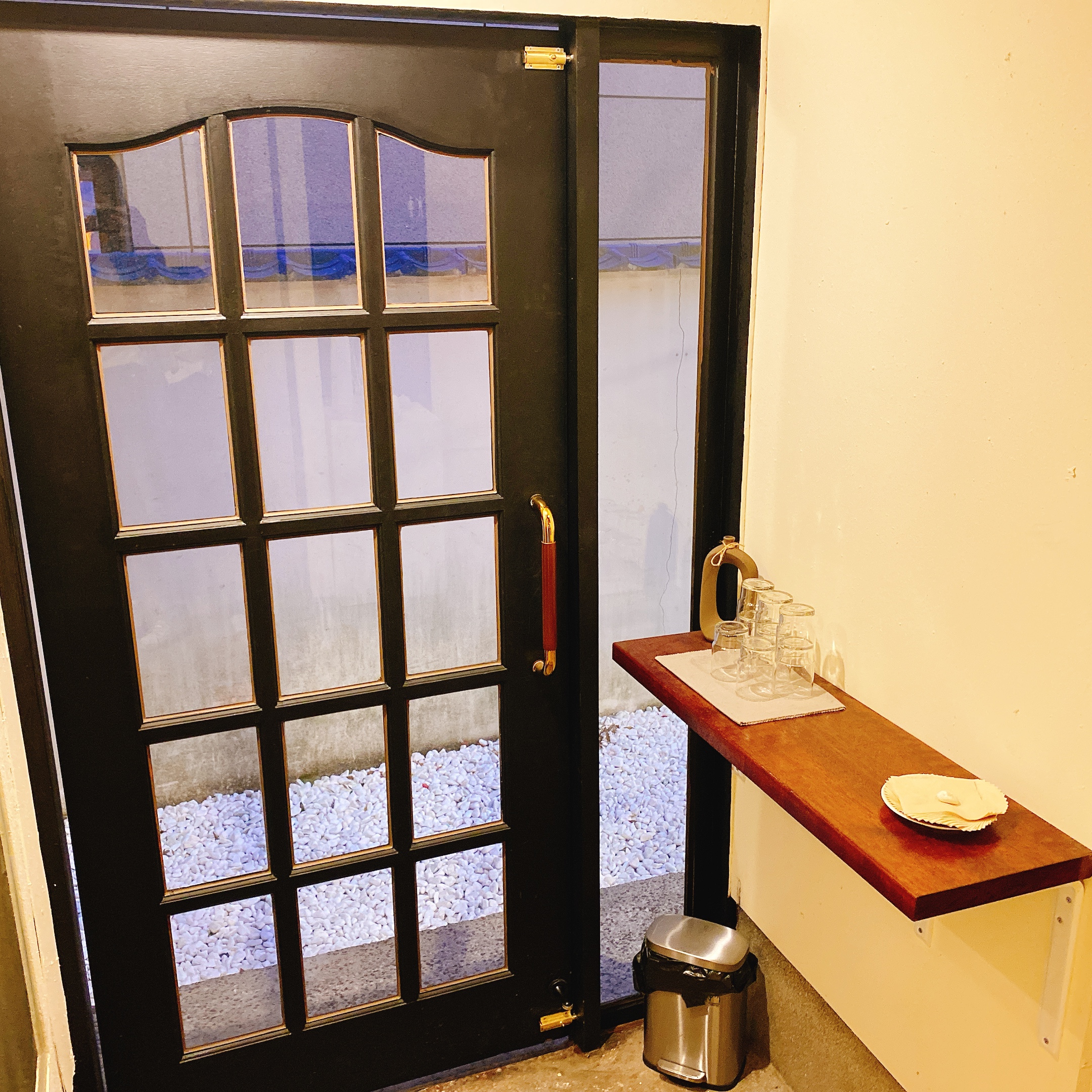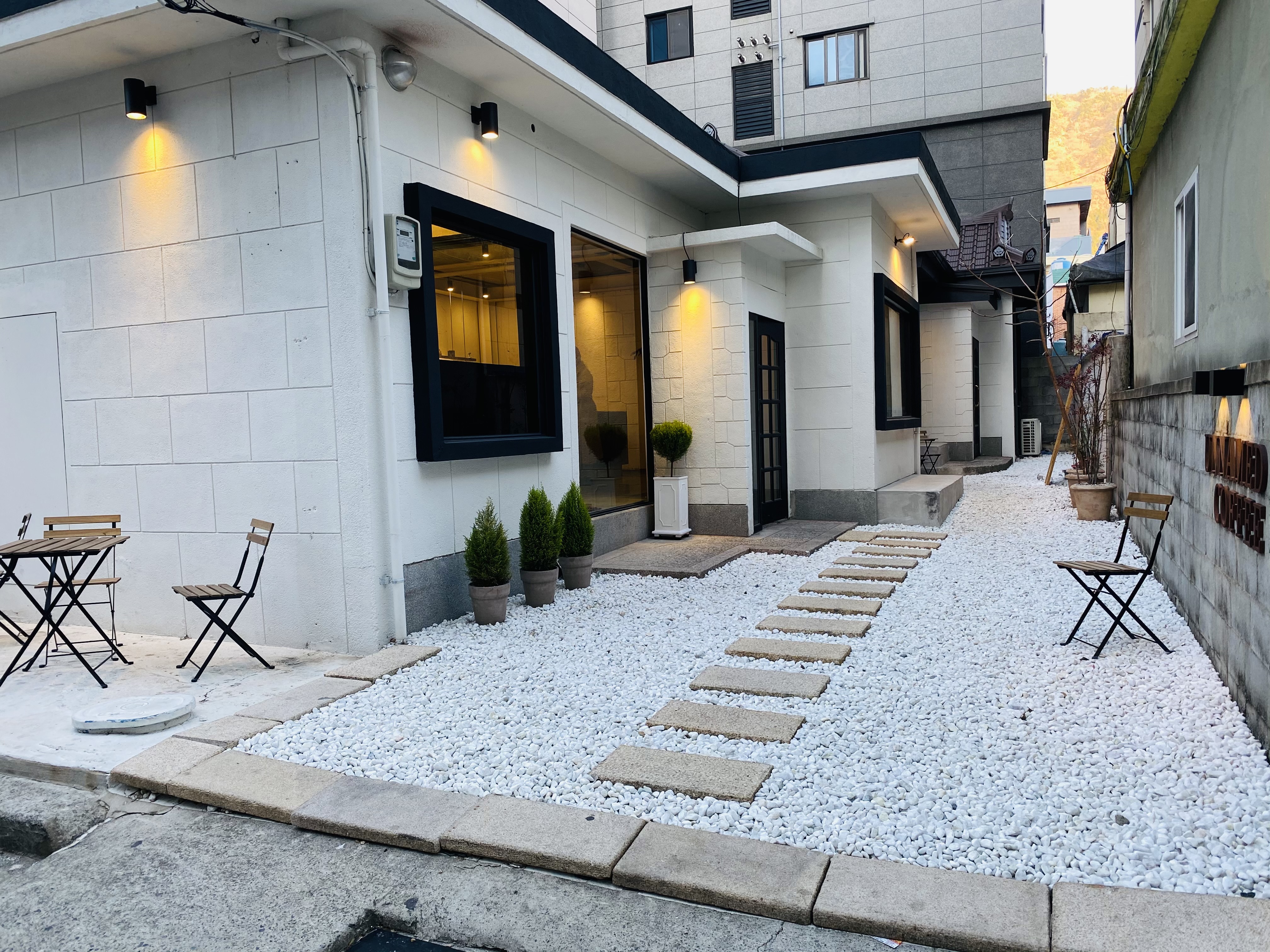 화이트톤의 건물과 야외 테이블이 있는 동화같은 마당이 맘에 들어 들어가게 되었다.